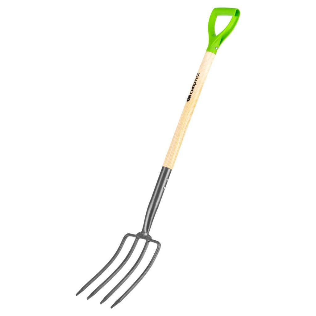 Sibrteh négyágú 195x295x1165mm méretû villa lakkozott keményfa nyéllel és a nyél végén D alakú forgató fogantyúval, kerti munkákhoz talaj lazításhoz ajánlottak.